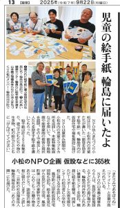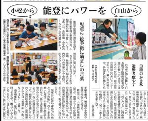 9月21日、小松市内の児童に書いてもらった能登を励ます絵手紙を、NPOの有志が輪島市内の仮設住宅、福祉施設、小学校に届けました。合わせてNPOの仲間らがキッチンカーで出店しているフェスティバルを応援し、奥能登の被災地も視察してきました。後日、館内に掲示した絵手紙の写真が届きました。新聞にも紹介されました。